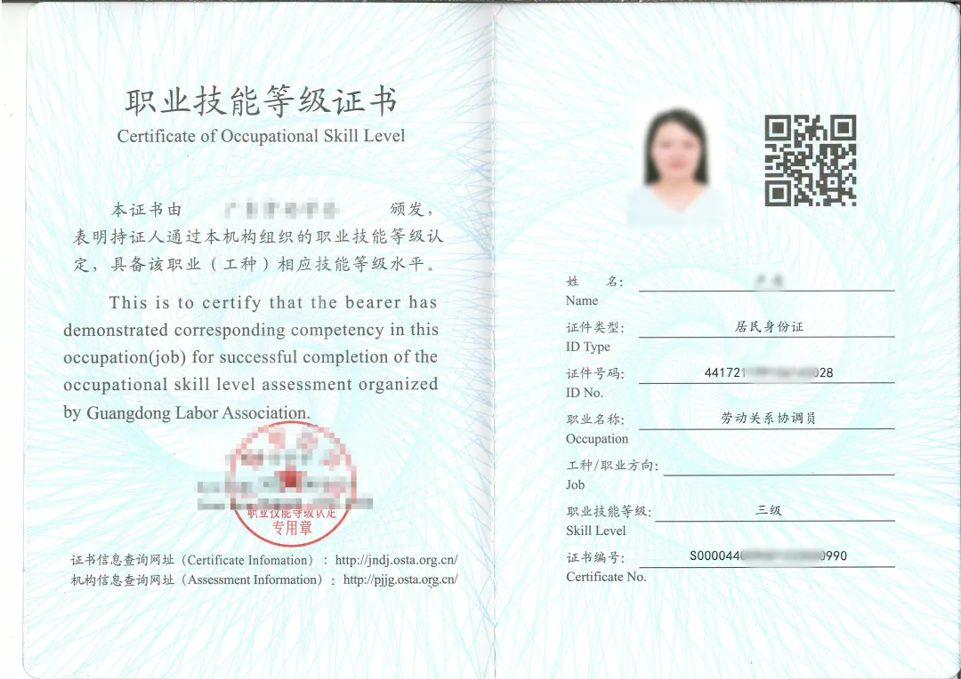 通过培训并经认定考试合格的学员,按照国家人力资源社会保障部统一的编码规则和“职业技能等级证书”规范样式要求,由广东劳动学会颁发职业技能等级证书。(证书信息可在人力资源和社会保障部职业技能等级证书信息查询系统查询,纳入技能人才统计范围 ,查询网址http://jndj.osta.org.cn/。)